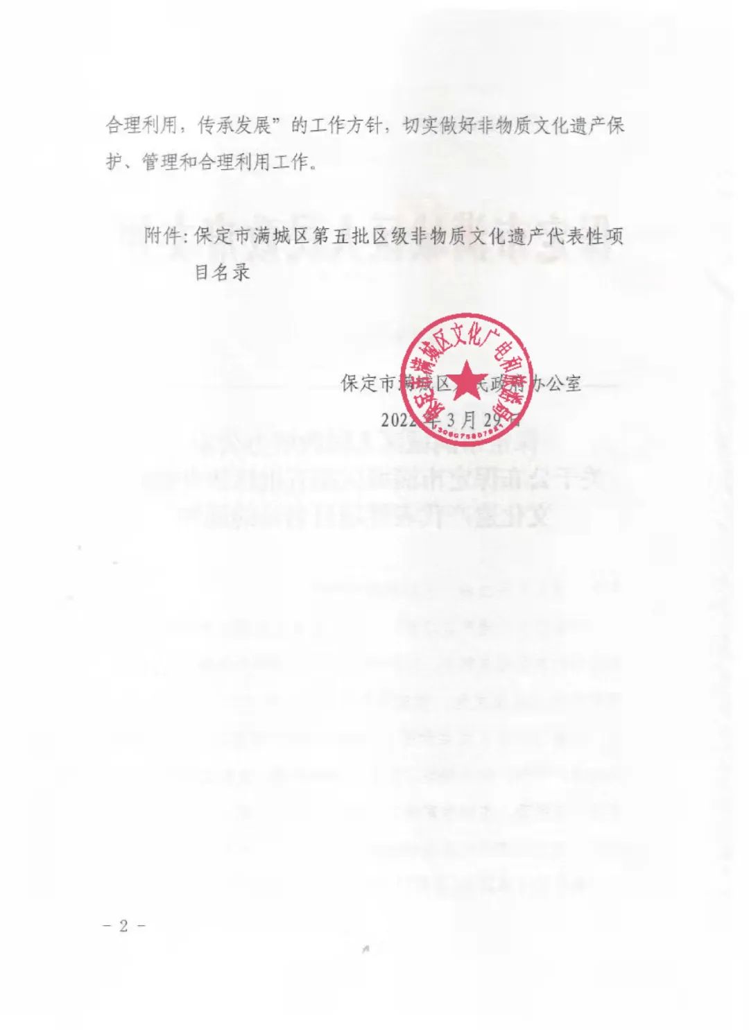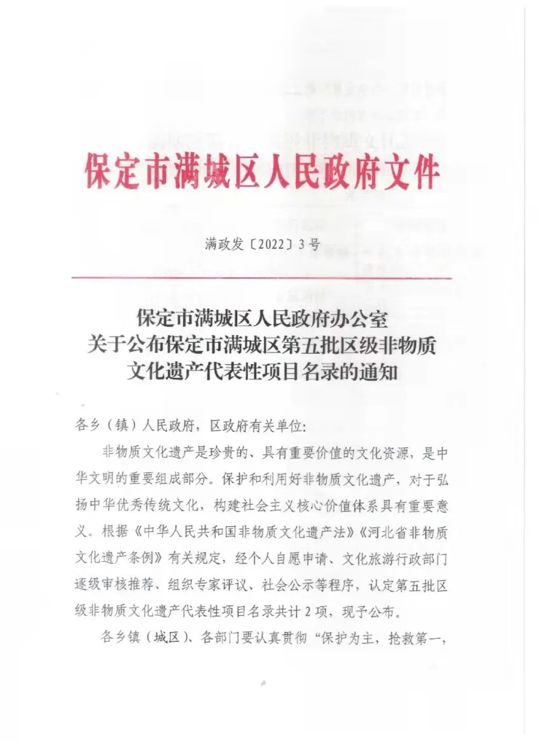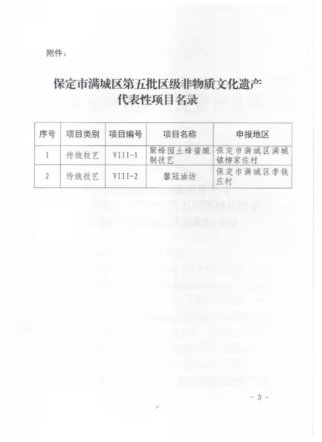 根據《中華人民共和國非物質文化遺產法》《河北省非物質文化遺產條例》有關規定,經個人自愿申請、文化旅游行政部門逐級審核推薦、組織專家評議、社會公示等程序,認定第五批滿城區非物質文化遺產代表項目的有“馨冠油坊、“聚豐園土蜂蜜釀制技藝”。